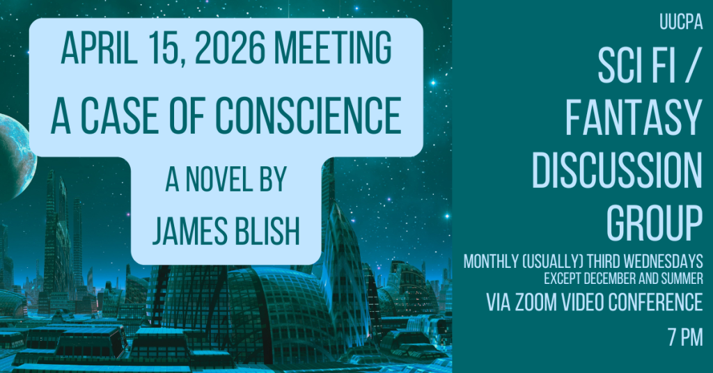 Our next meeting is April 15th, 7-8:00, on Zoom. We'll discuss the novel A Case of Conscience (1958) by James Read more