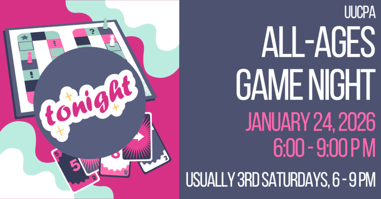 Game Night at UUCPA is TONIGHT, Saturday January 24 6-9 PM Room 4-5. Bring your friends, food and whatever boardgame you’ve been having the most fun with to play. All ages welcome. No RSVP needed.
