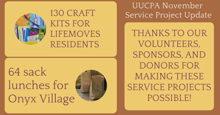 Many thanks again to everyone who helped with these service projects, to the Social Justice Action Council and Children and Youth Religious Education committees for sponsoring them, and to all of UUCPA’s donors for supporting the church and making service projects like these possible!