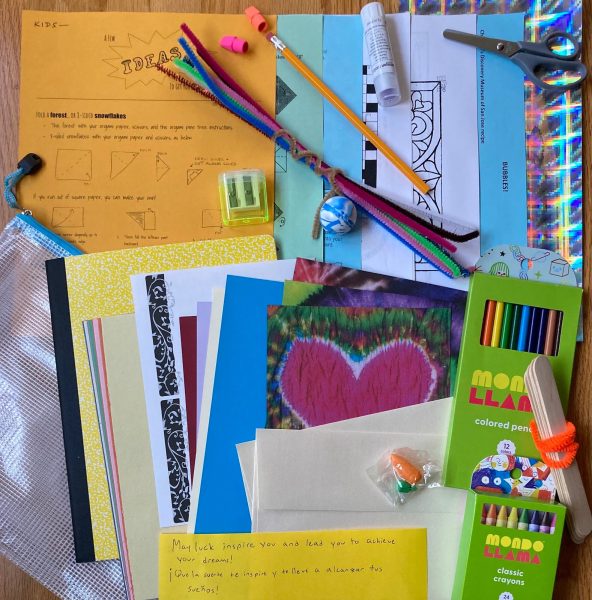 The adult kits had markers instead of crayons, more detailed coloring pages, a mechanical pencil and ballpoint pen, and no toys or diffraction paper (sorry, adults). All of the kits had colored pencils, card stock, construction paper, a composition book, scissors, a #2 pencil, a pencil sharpener, a glue stick, sticker labels, fancy envelopes, tie-dye origami paper, kirigami and origami projects, coloring pages, mazes, crossword puzzles, and other activities.