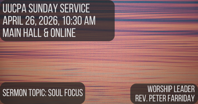If you prefer to join the community of those attending online, there are two options. One, join the service via Zoom bit.ly/uucpa_service_1030am_v3. To get the passcode, email sundayservice@uucpa.org or call UUCPA’s outgoing voicemail message, 650-494-0541. It is also included in the weekly update emails. Two, to watch the service live on our Facebook page (no passcode required), visit UUCPA’s live Facebook feed. Follow along in the order of service bit.ly/uucpa_oos_20260426.
