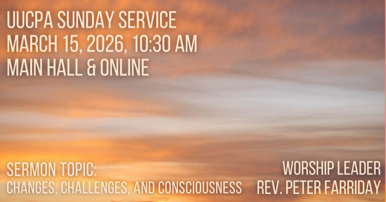 If you prefer to join the community of those attending online, there are two options. One, join the service via Zoom bit.ly/uucpa_service_1030am_v3. To get the passcode, email sundayservice@uucpa.org or call UUCPA’s outgoing voicemail message, 650-494-0541. It is also included in the weekly update emails. Two, to watch the service live on our Facebook page (no passcode required), visit UUCPA’s live Facebook feed. Follow along in the order of service, bit.ly/uucpa_oos_20260315.