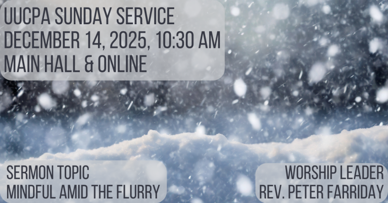 If you prefer to join the community of those attending online, there are two options. One, join the service via Zoom bit.ly/uucpa_service_1030am_v3. To get the passcode, email sundayservice@uucpa.org or call UUCPA’s outgoing voicemail message, 650-494-0541. It is also included in the weekly update emails. Two, to watch the service live on our Facebook page (no passcode required), visit UUCPA’s live Facebook feed. You can follow along in the order of service: bit.ly/uucpa_oos_20251214.