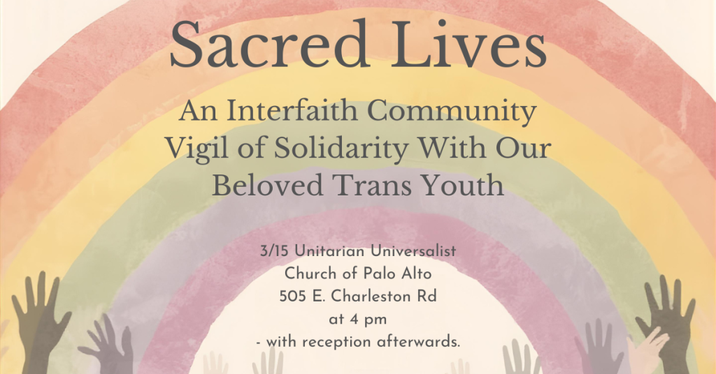 Sacred Lives: An Interfaith Community Vigil of Solidarity With Our Beloved Trans Youth, March 15 at 4pm at UUCPA. In Read more